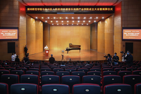 10月21日上午,我校与吴兴区人民政府共建“音乐戏剧产业学院”正式揭牌成立。中共吴兴区委副书记、区长潘永锋,区委常委、宣传部长朱小芳,副区长金斌斌,校党委书记金佩华,党委副书记陈永华,副校长李庆峰,党委委员、党校办主任劳士健出席,吴兴区区府办、区委宣传部、区文旅体局、区城投集团,我校党校办、教务处、社会合作处、音乐学院等相关部门和学院负责人,以及30余名师生代表参加了揭牌仪式。