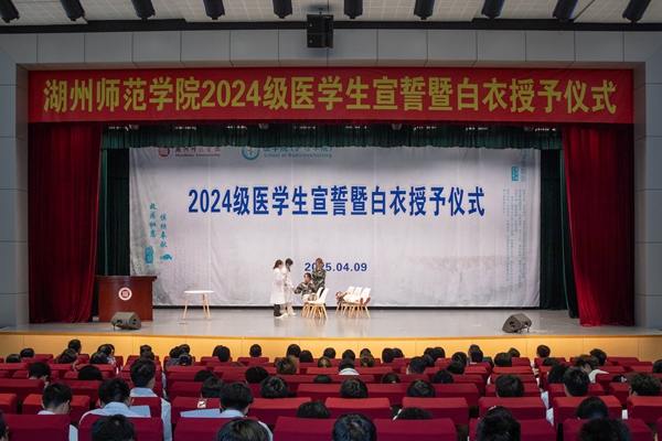 我校2018届临床医学专业校友、浙江大学在读博士杨波作为校友代表发言。他表达了对母校的感激之情,勉励学弟学妹们要潜心学习、专注钻研、勇敢前行、胸怀大志、追求卓越。新生代表、2024级口腔医学专业刘颖同学表示,相聚湖师是一种缘分,来到医学院,就是“医家人”。她号召全体医学生谨记医护工作者的使命和担当,向医学前辈和优秀校友学习,无愧身穿白衣,无愧“医者”之名。