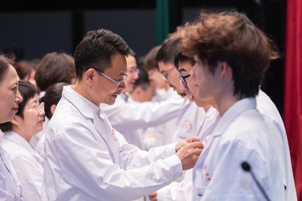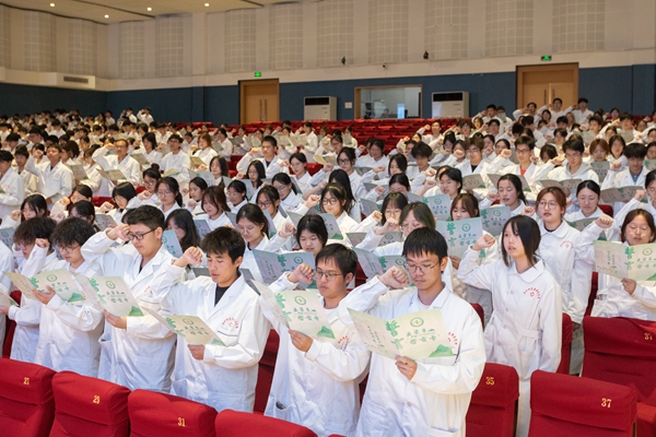 “健康所系,性命相托。当我步入神圣医学学府的时刻,谨庄严宣誓:我志愿献身医学,热爱祖国,忠于人民……”445名2024级新生身穿白衣,在附属第一医院副院长张颖的带领下庄严宣誓。